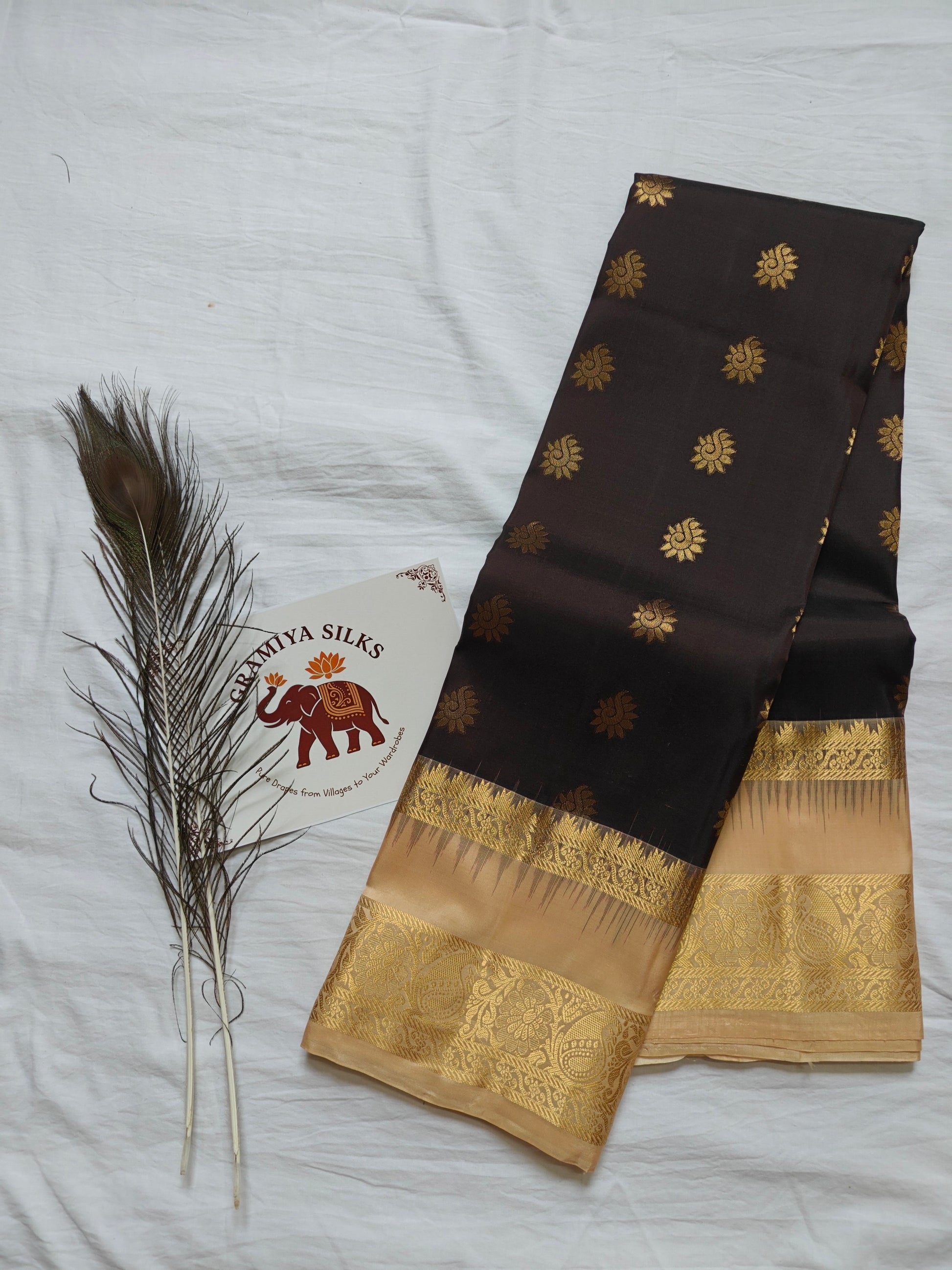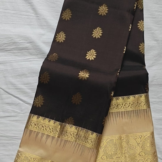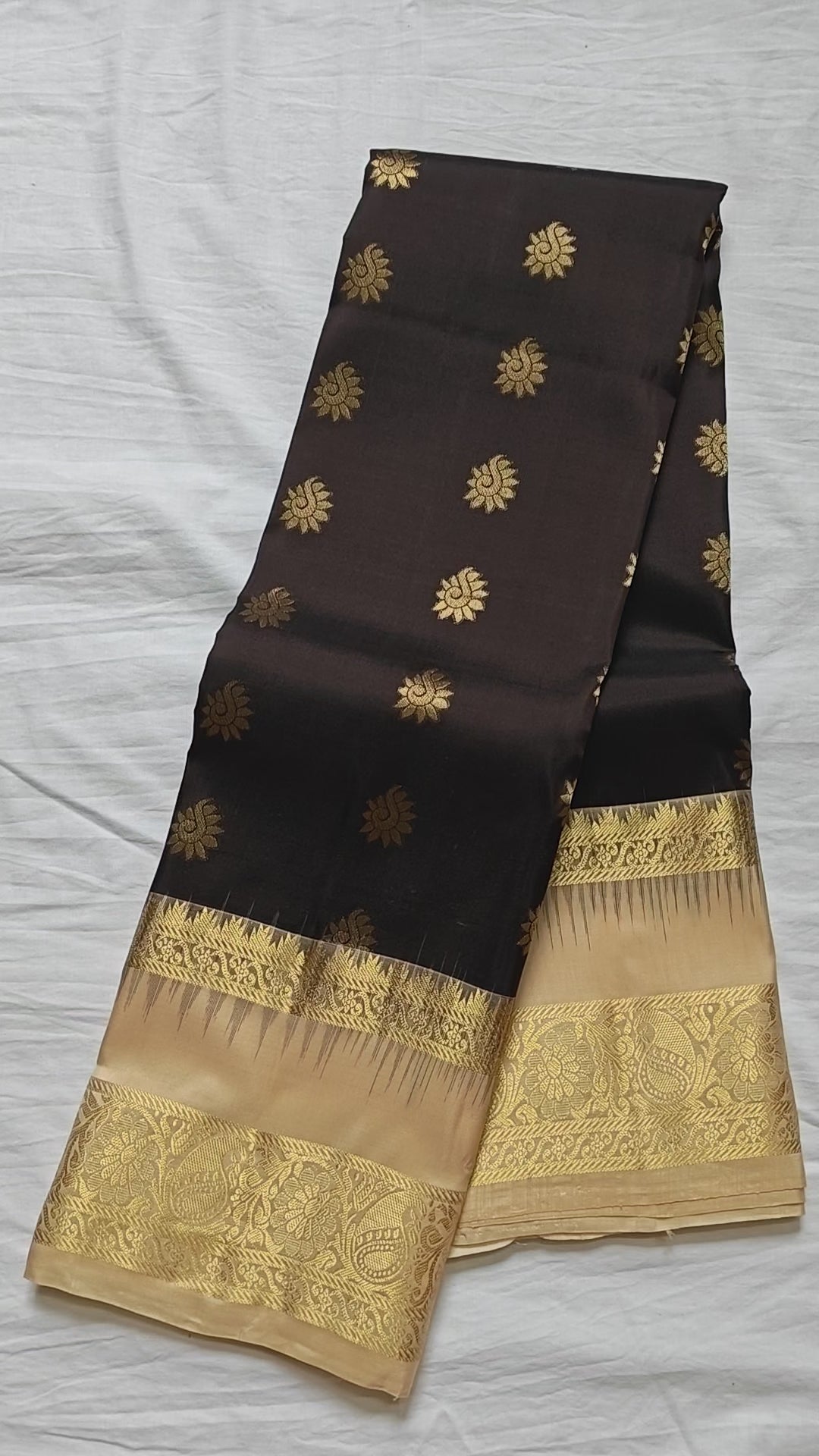 Colours: Espresso brown body, gold motifs, vanilla cream border, rich gold zari Pallu & blouse