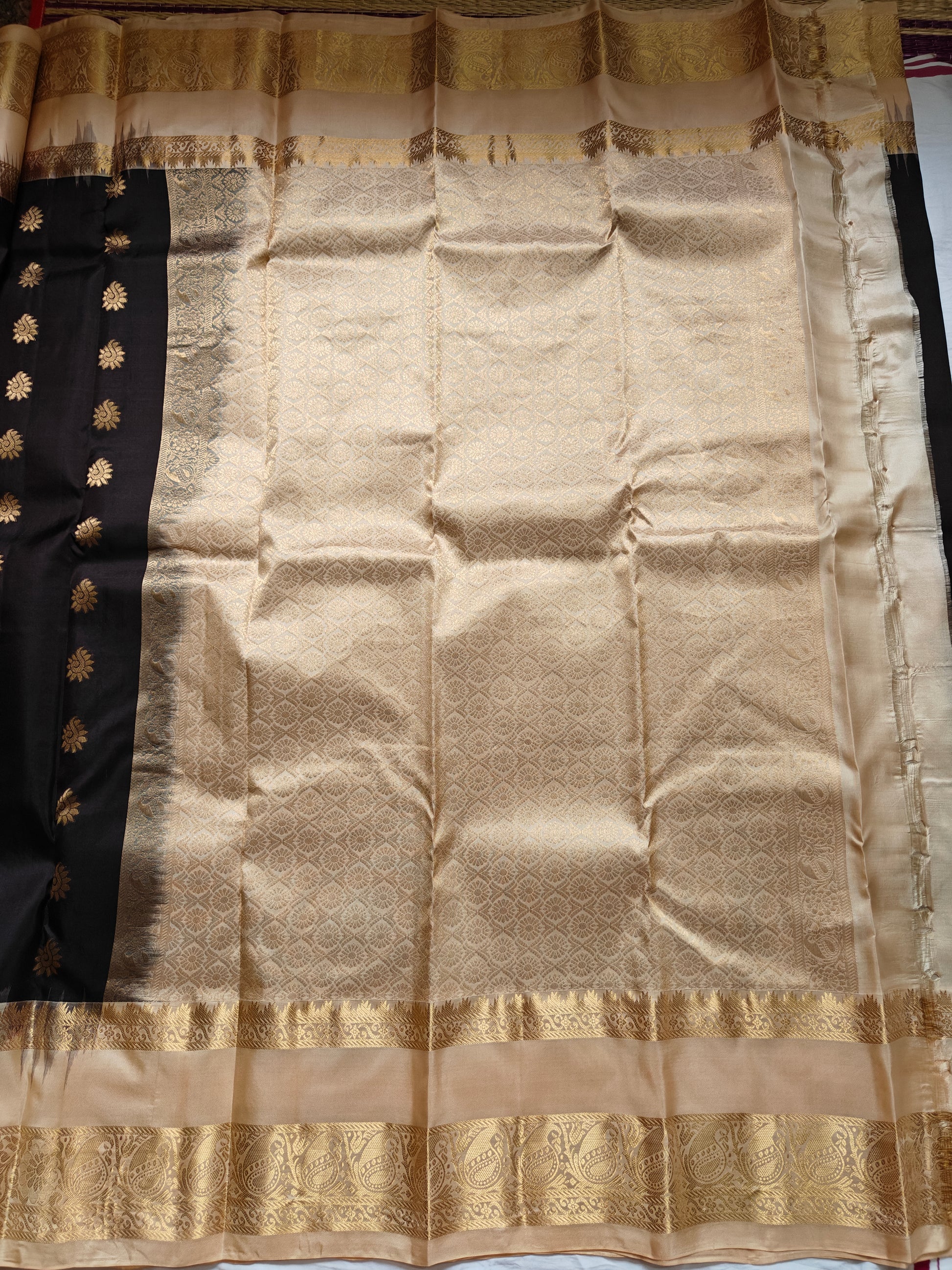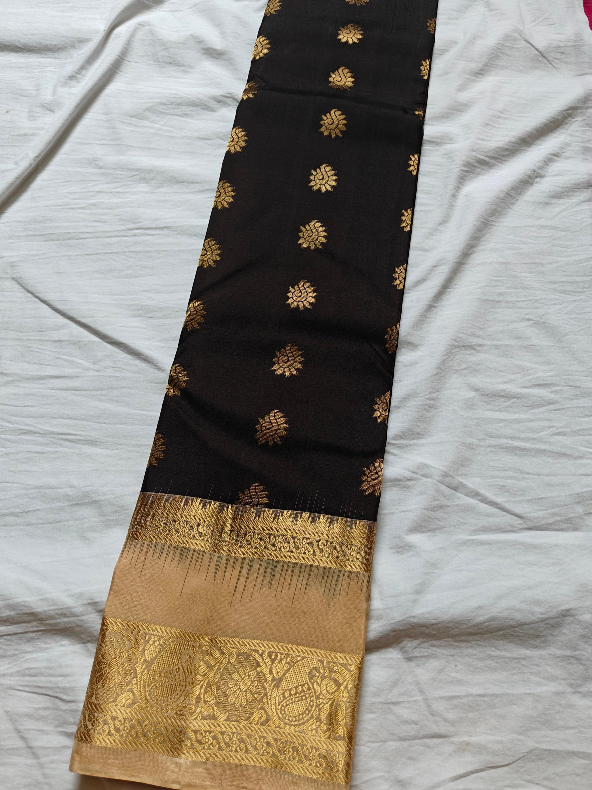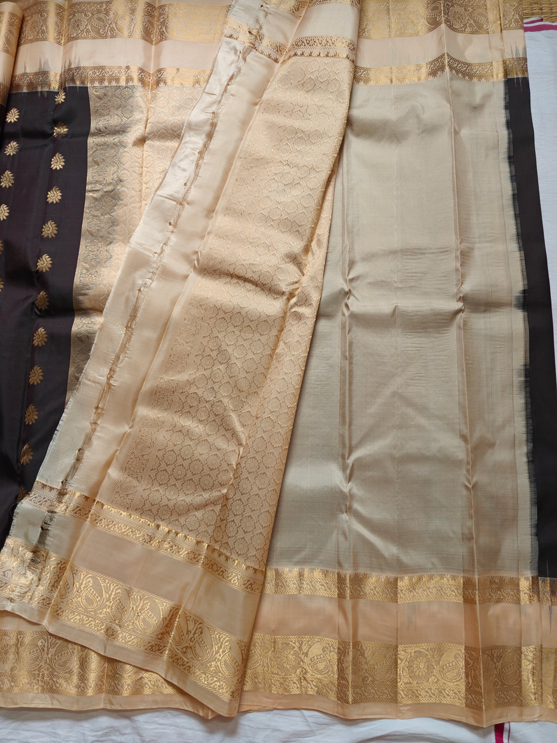 Colours: Espresso brown body, gold motifs, vanilla cream border, rich gold zari Pallu & blouse
