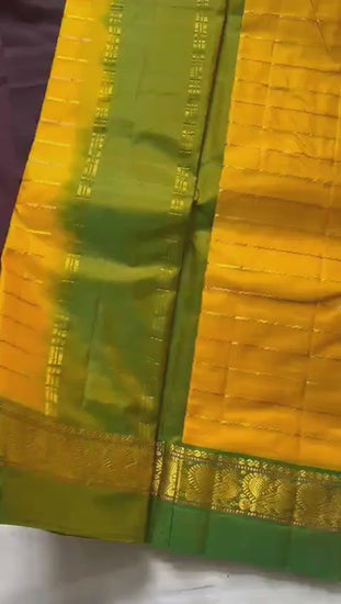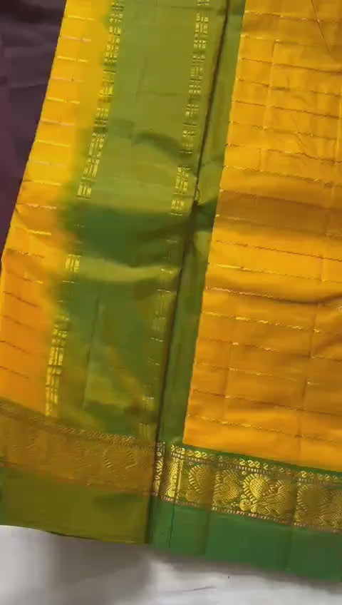 Colours: Mango yellow body with gold and copper alternate stripes, Ganga Jamuna border of light Blue and lime Green, Lime green blouse & pallu