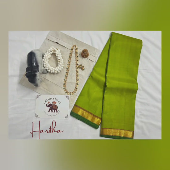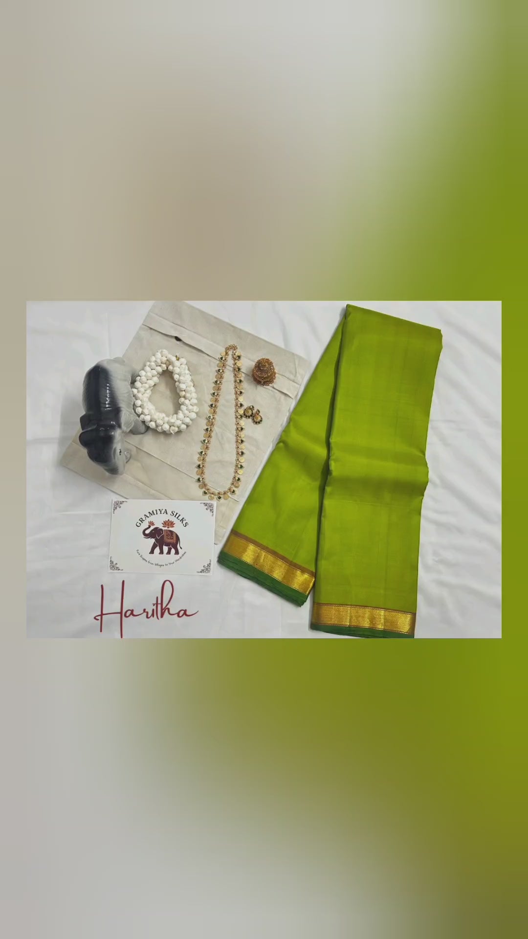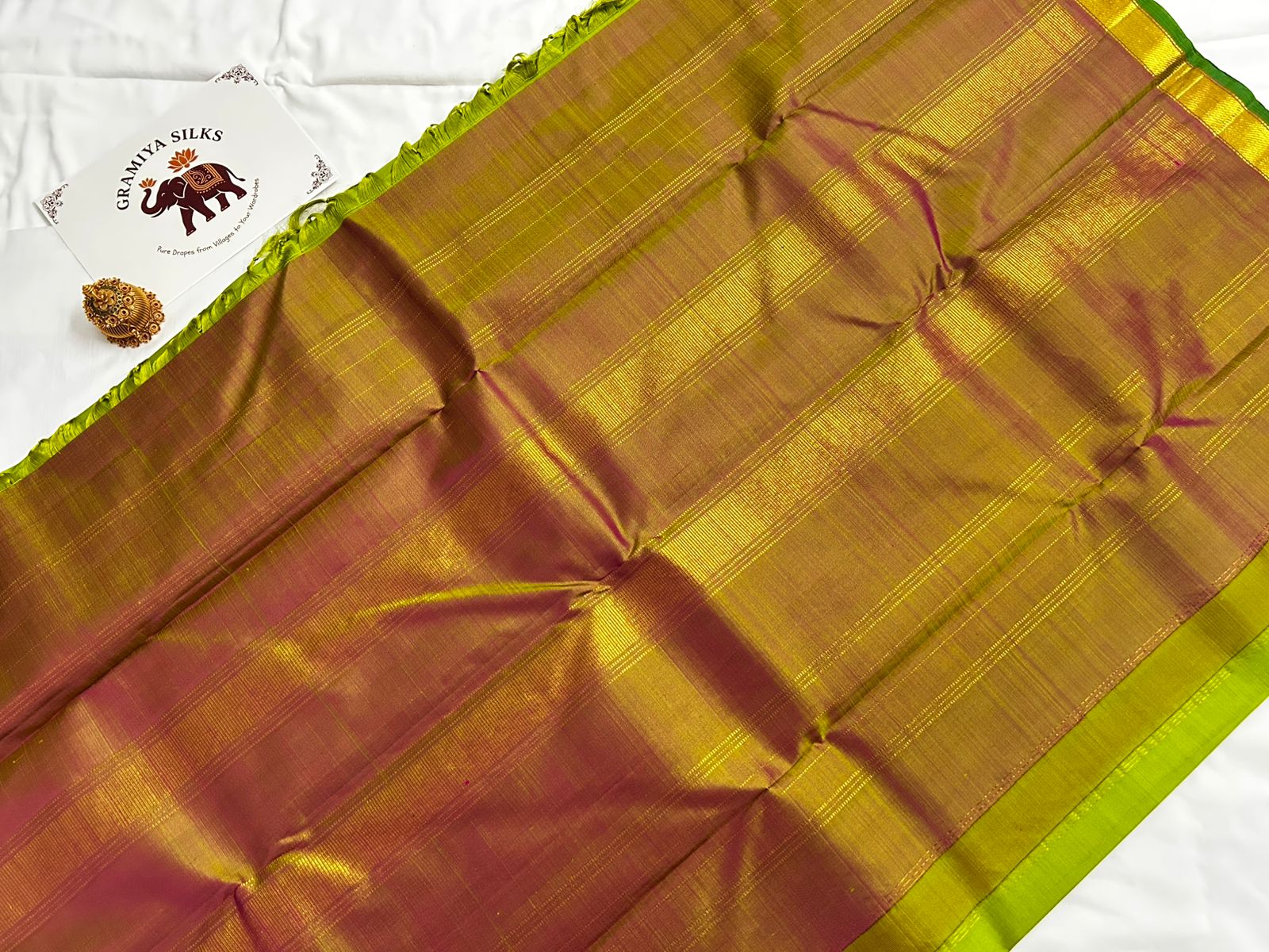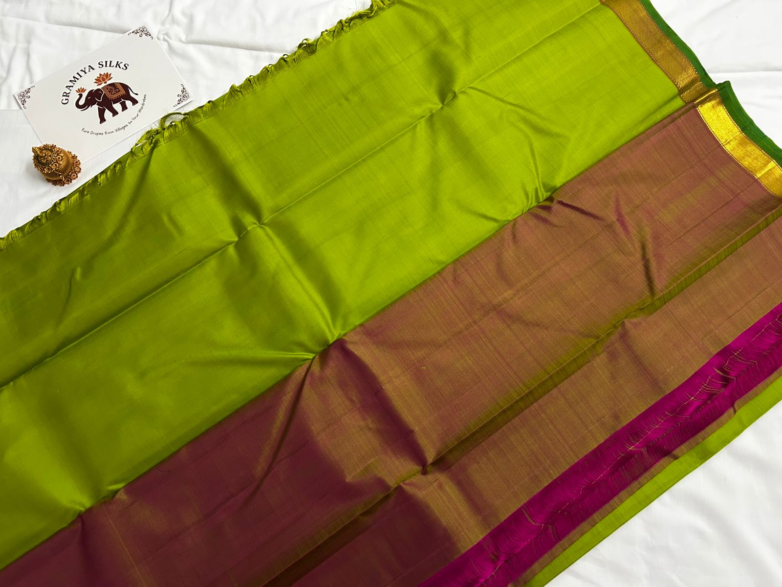 When your saree whispers confidence and blushes with charm… Gramiya Silks bringing authentic kanchipuram silk sarees from looms to your wardrobes! Colour - Leaf green with onion pink double shade pallu.