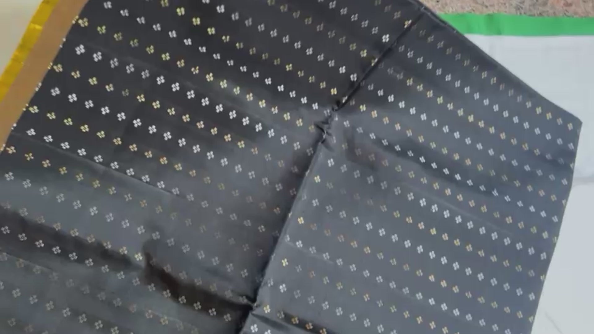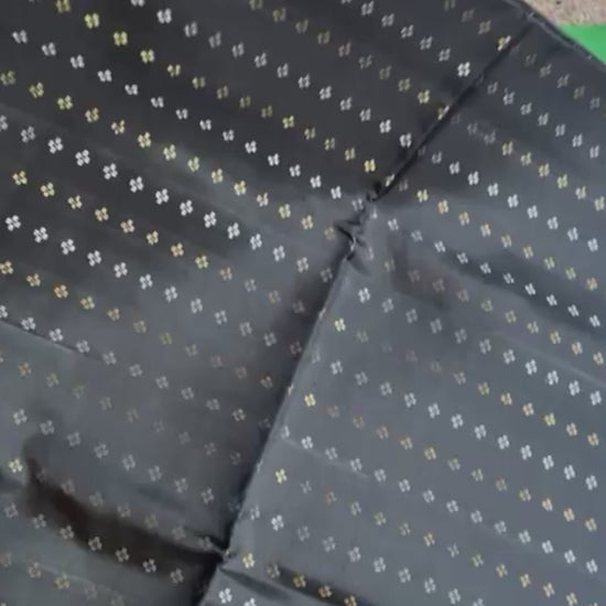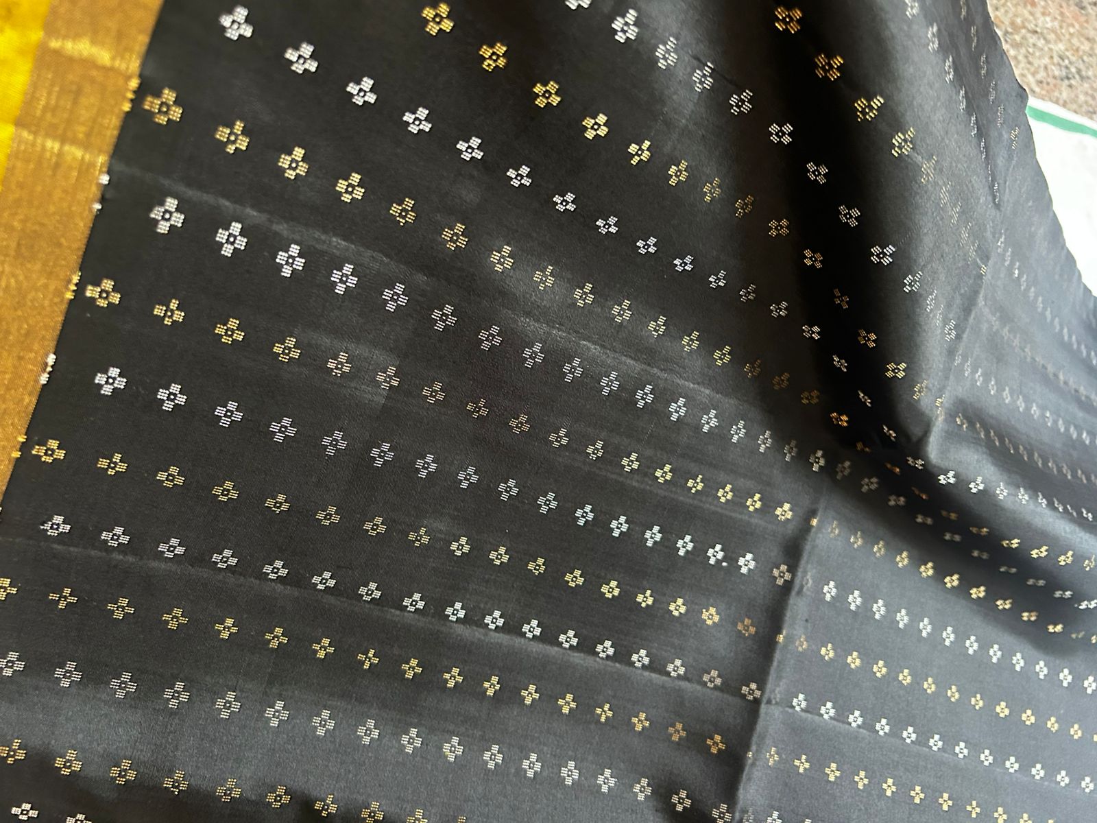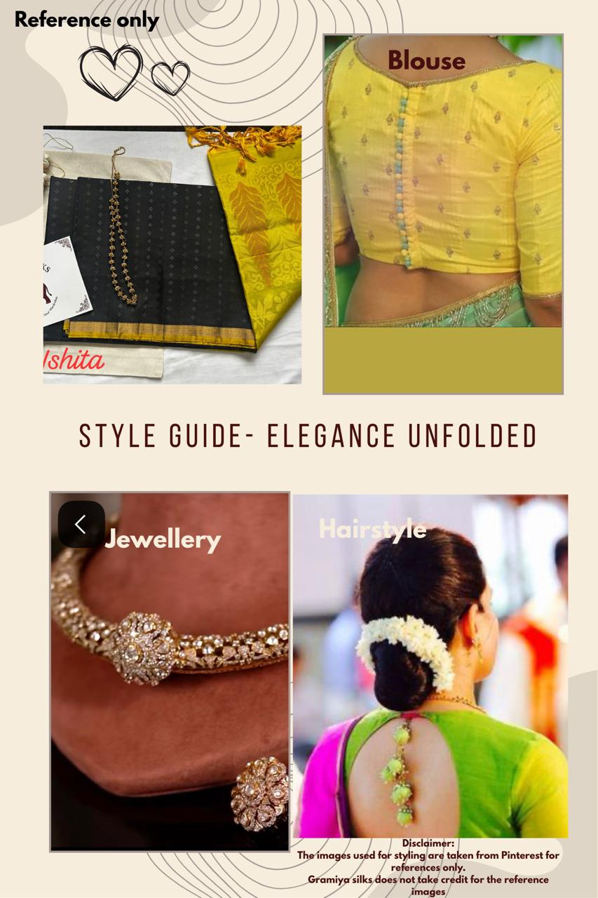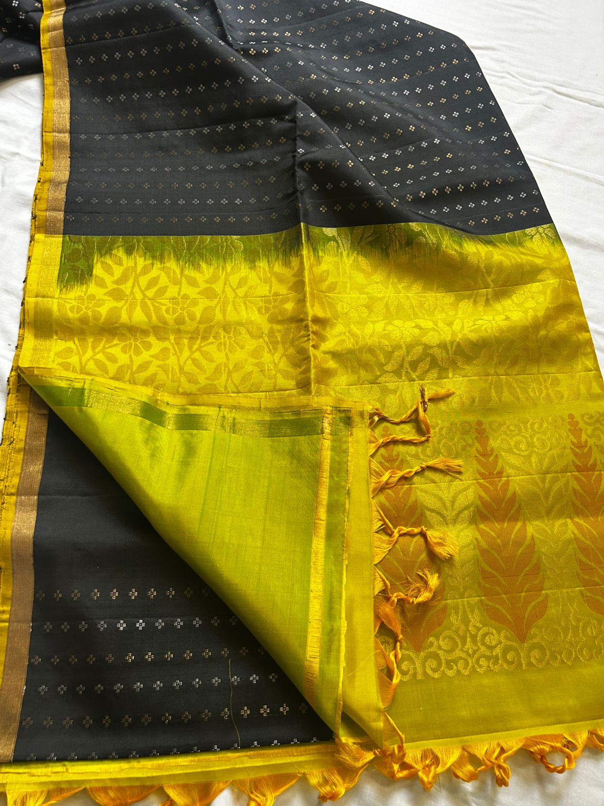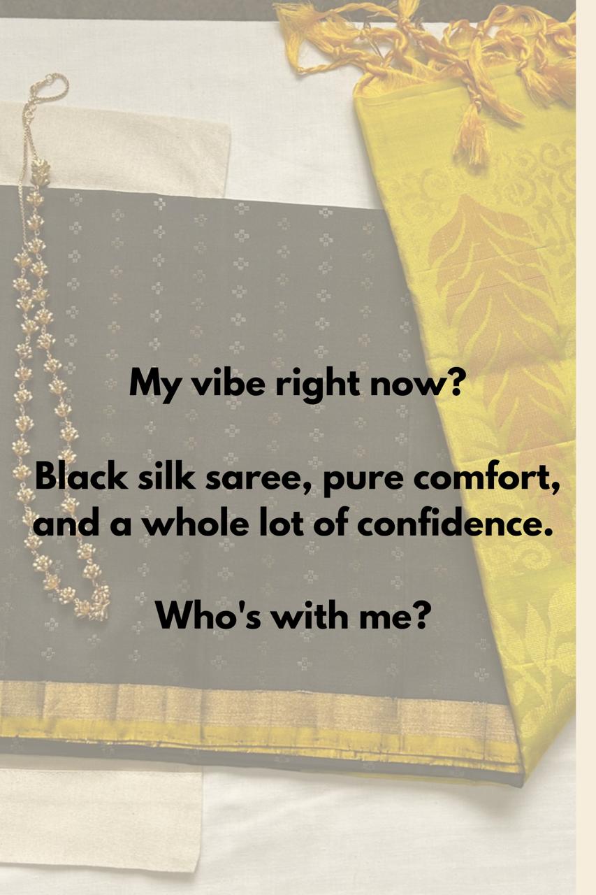 Black's back, and its brought its most vibrant friend! This isn't your grandma's saree – it's bold, it's playful, it's making a statement. Black soft silk Saree with copper and silver alternating butta all over the body, and of course the zesty lemon yellow contrast- the perfect vibes.