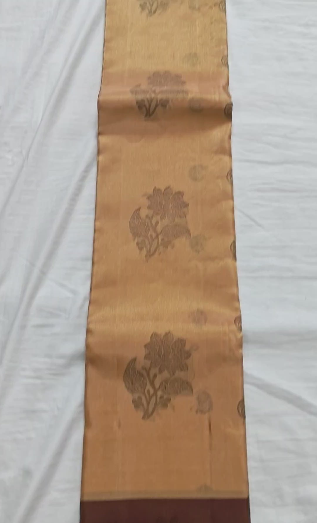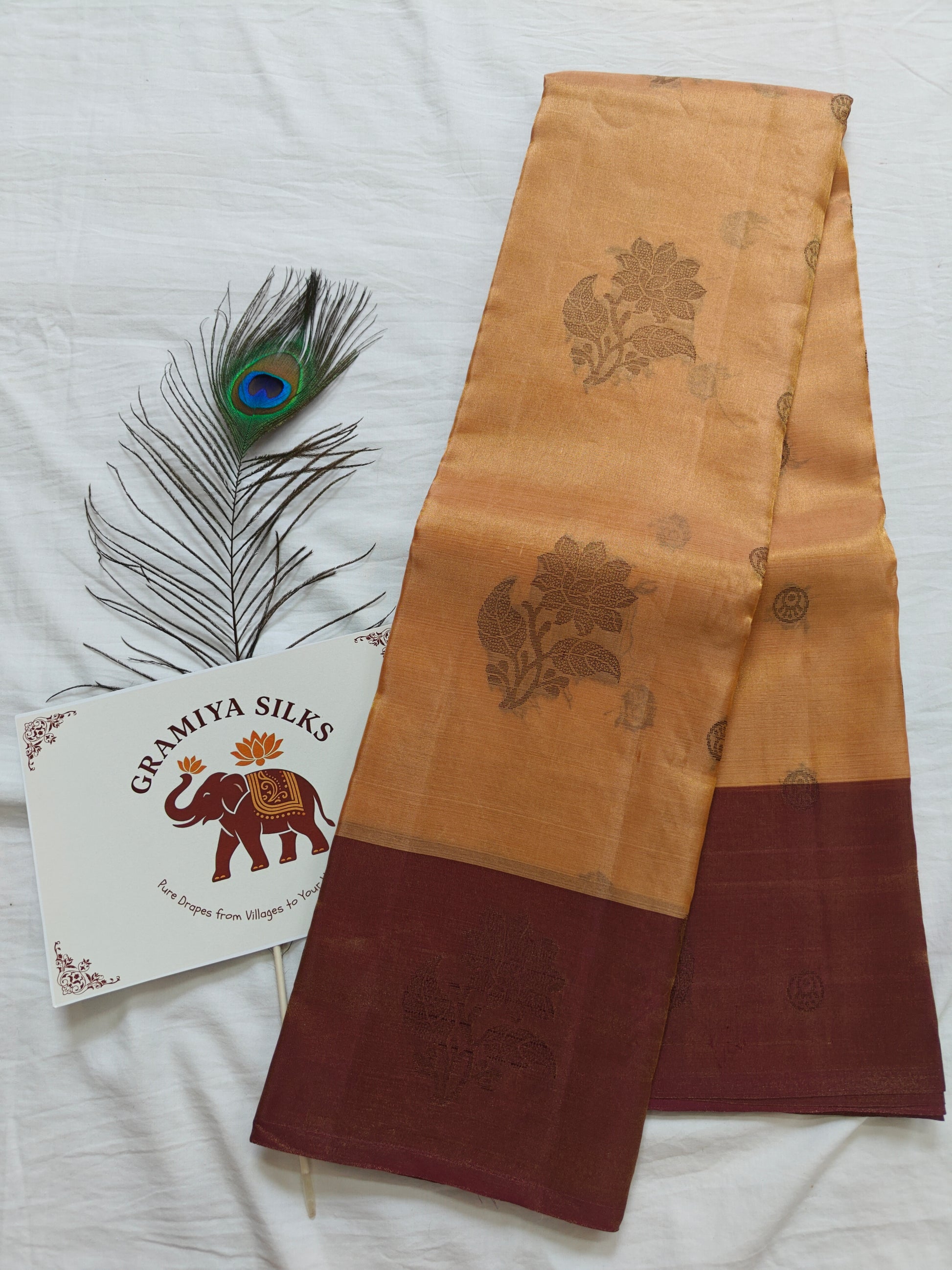 A musical angel in tissue pure silk saree. This saree sings with a quiet harmony of colors and a melodious flow. Its beautiful drape and graceful design are a symphony in silk.