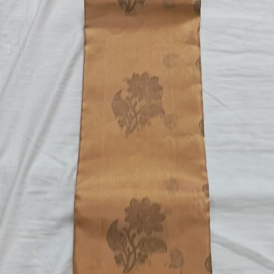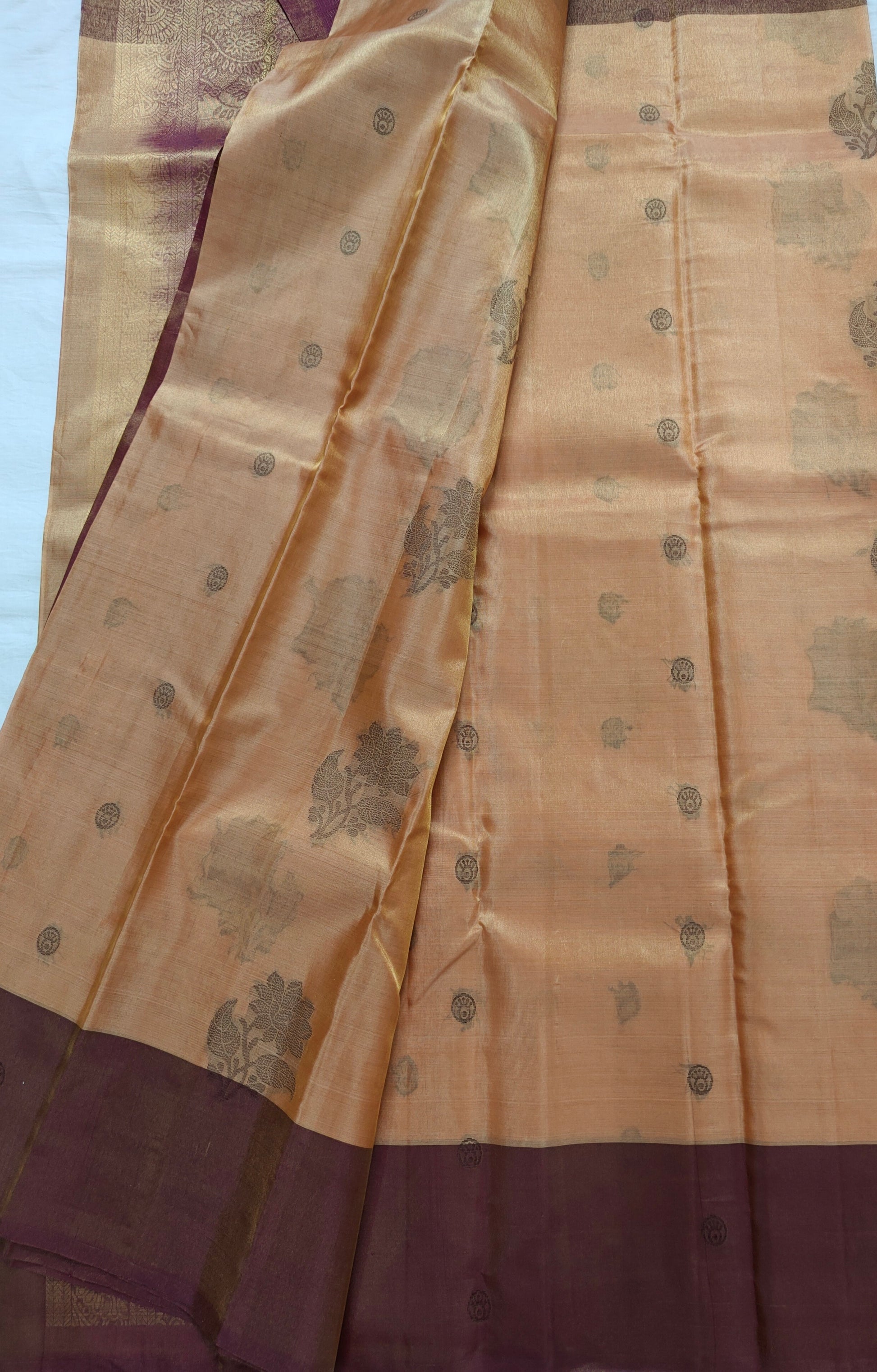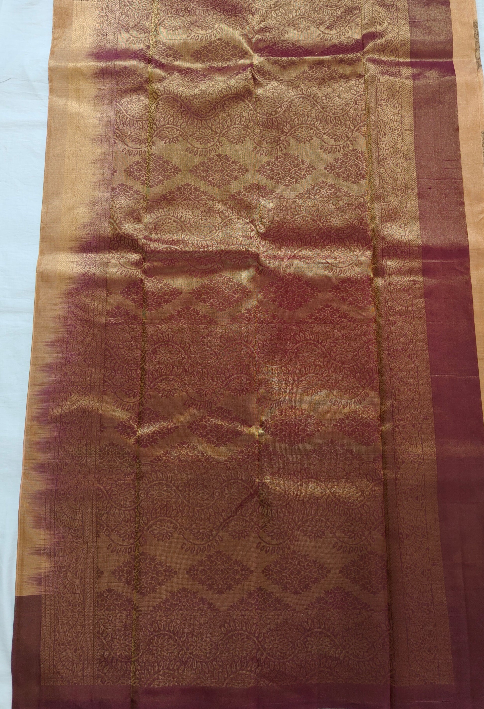 Colours: Pastel peach in Tissue silk Woven body, Tissue Purple blouse & pallu