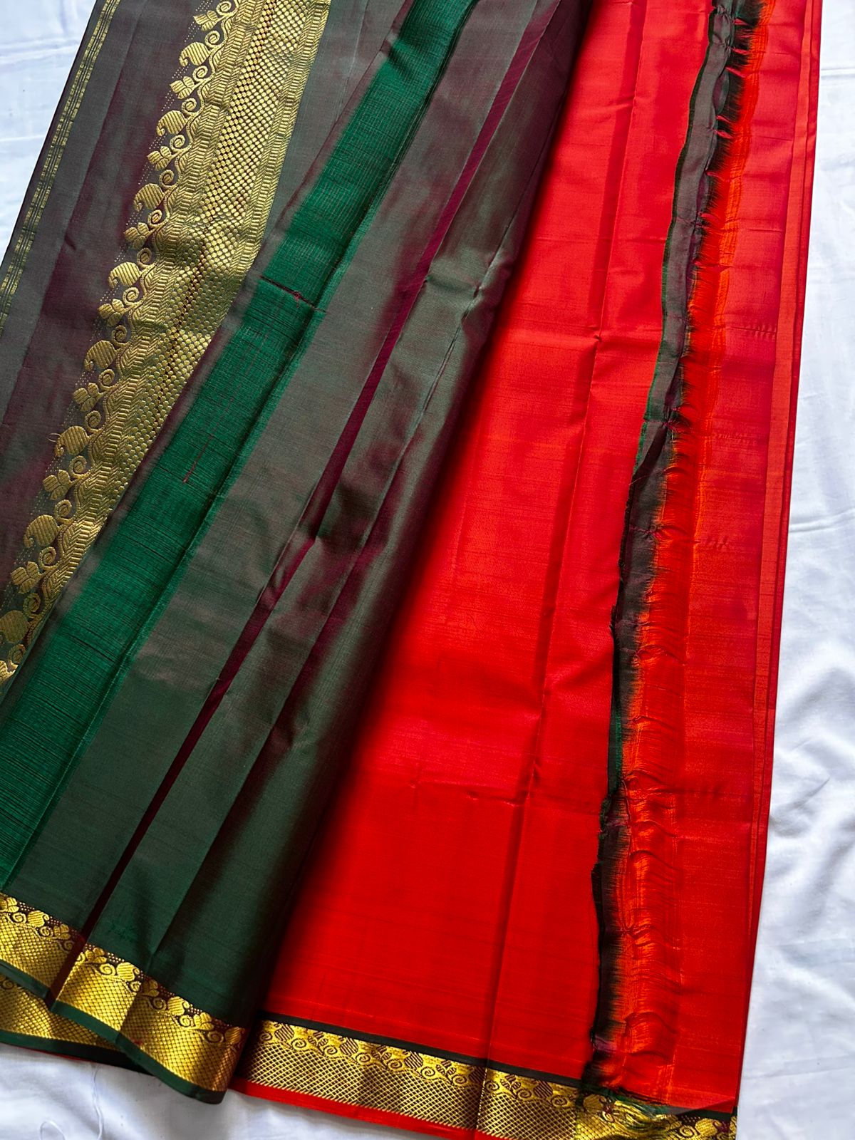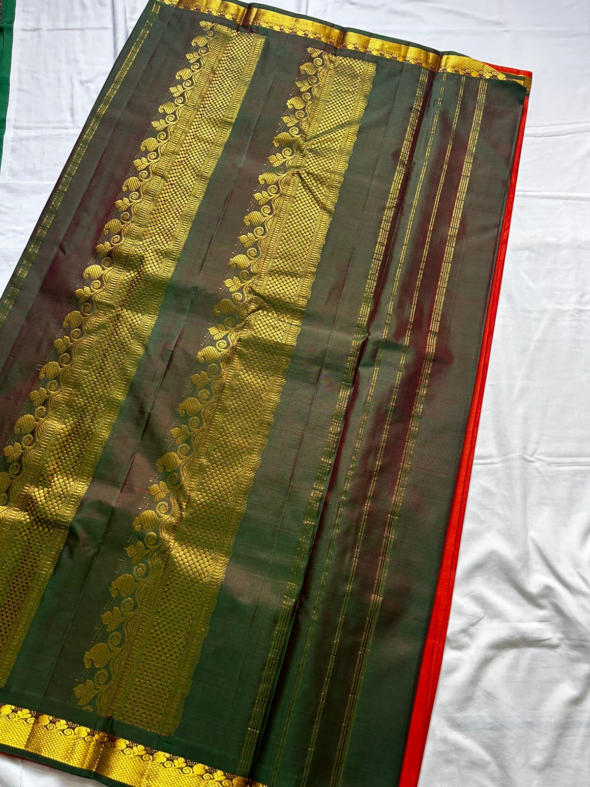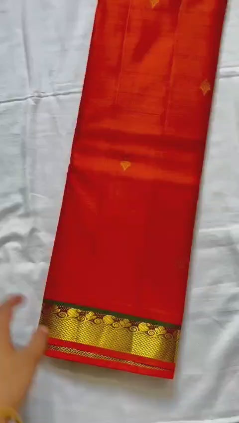 Colours: Reddish Orange body, small butta on body, double shade green border, Pallu and blouse