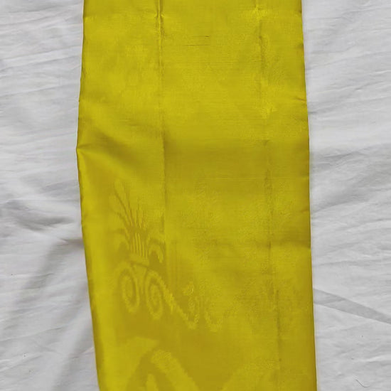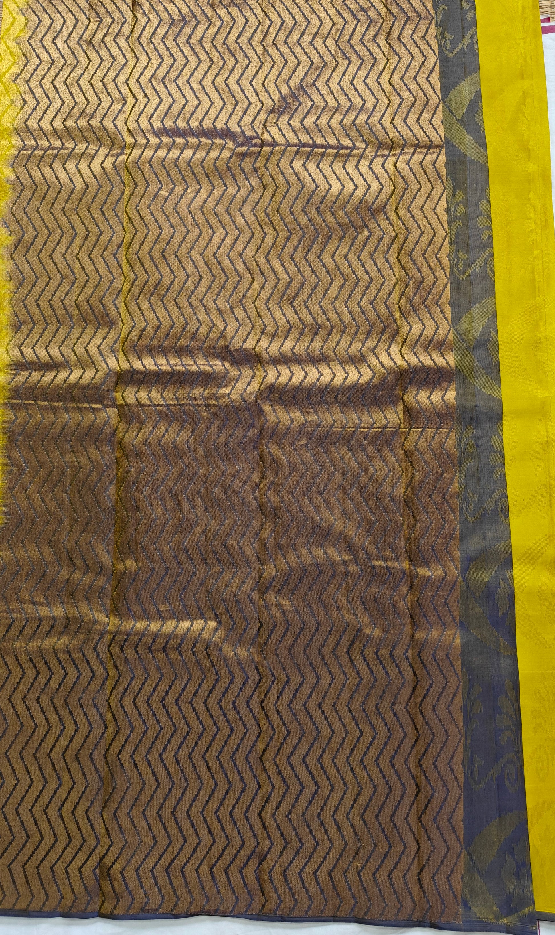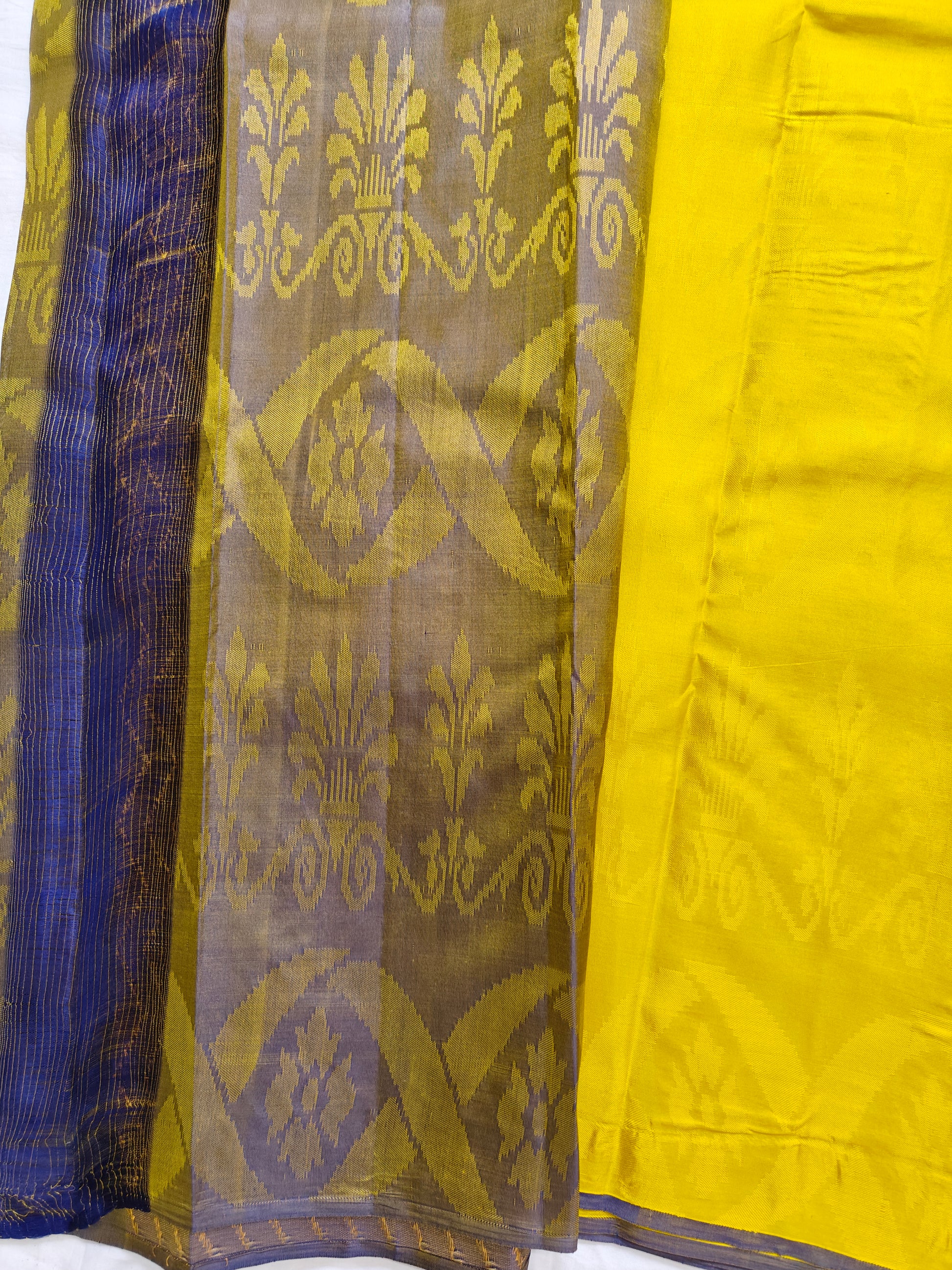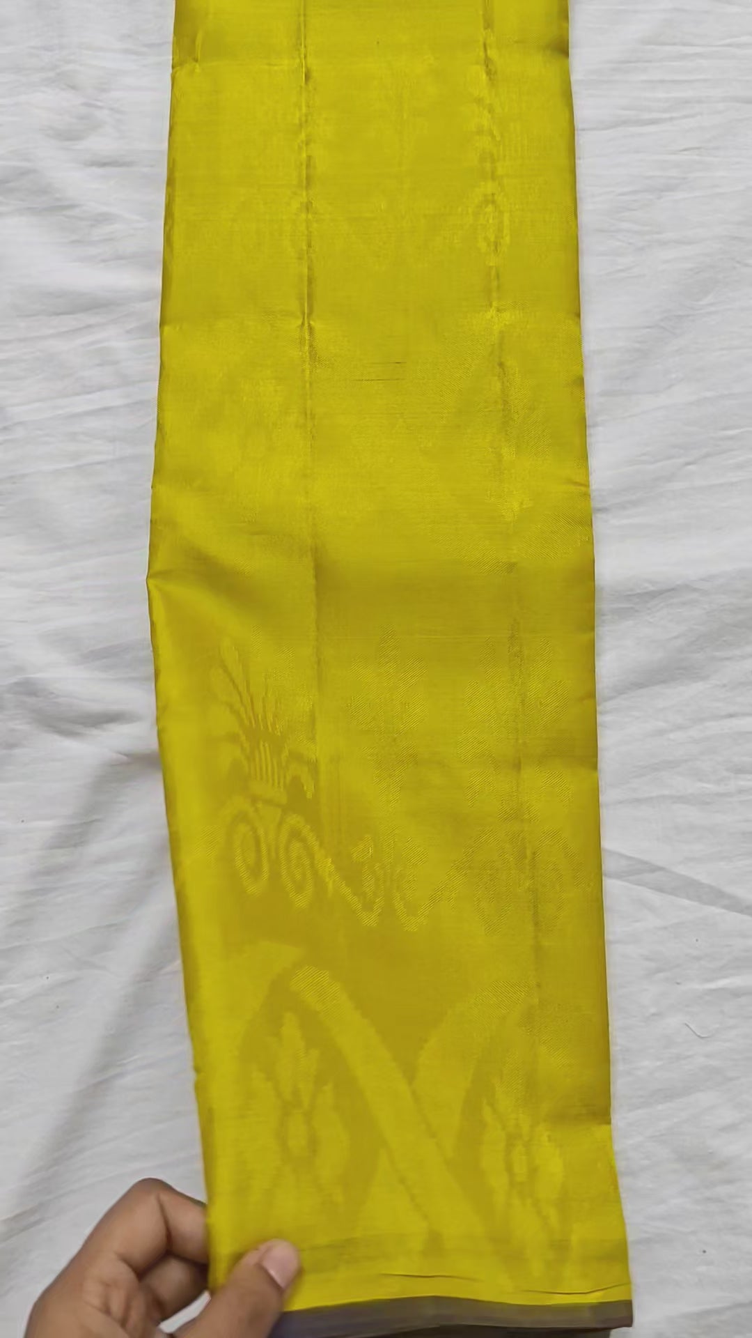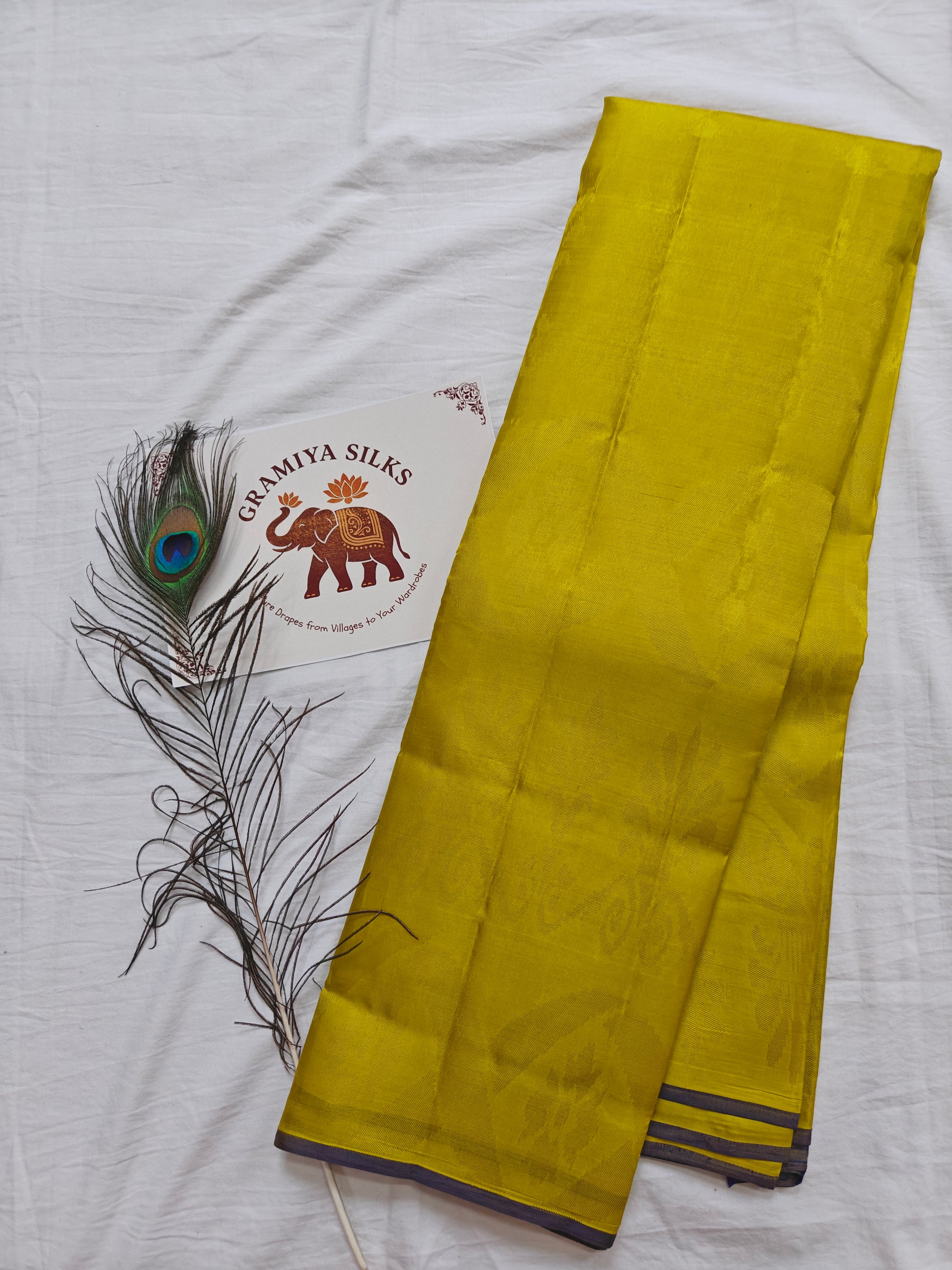 Colours: Sunflower Yellow Self Design body, purple contrast pallu & blouse
