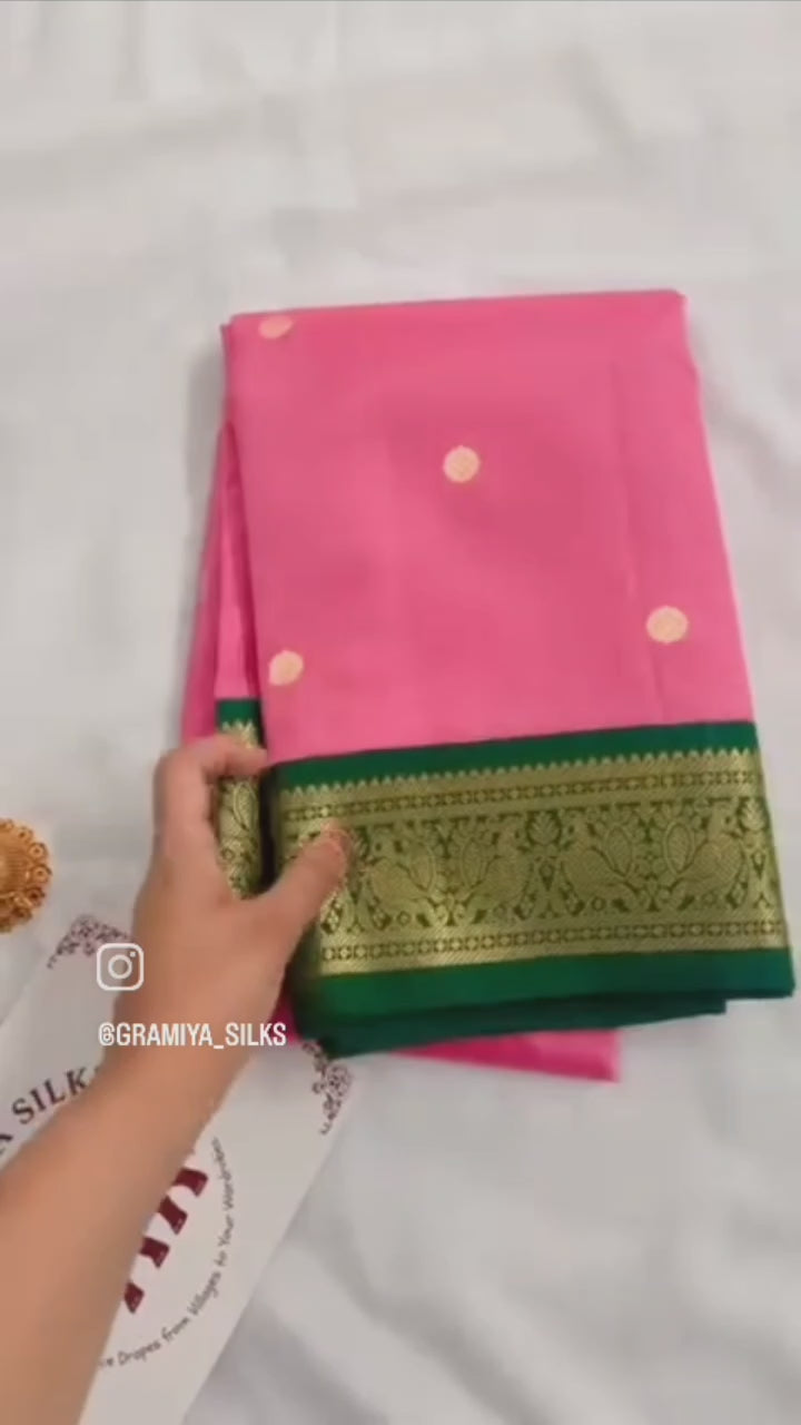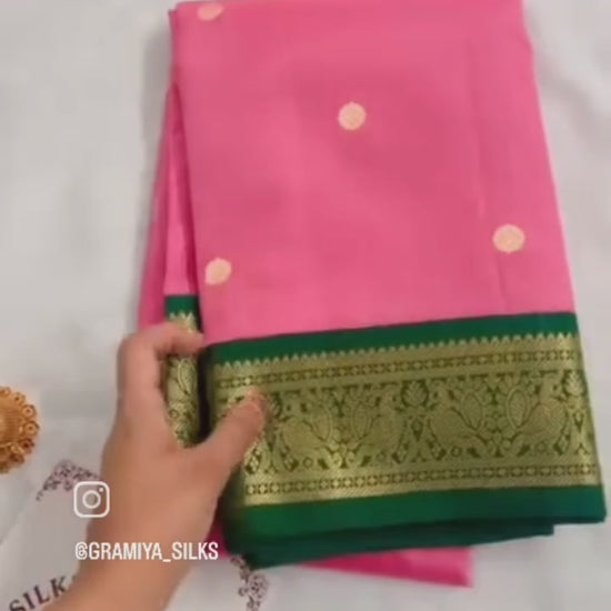 Like a lotus blooming on still water Lotus pink body with gold zari motifs and dark green border