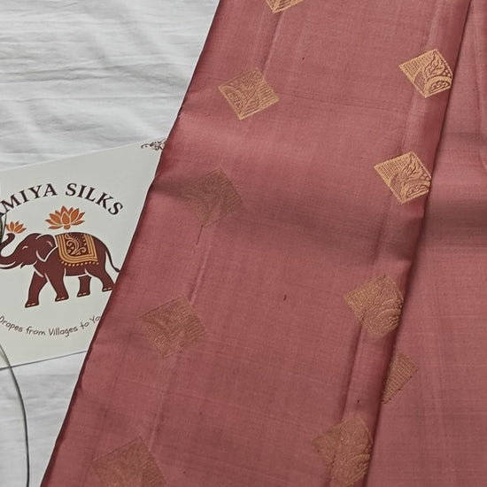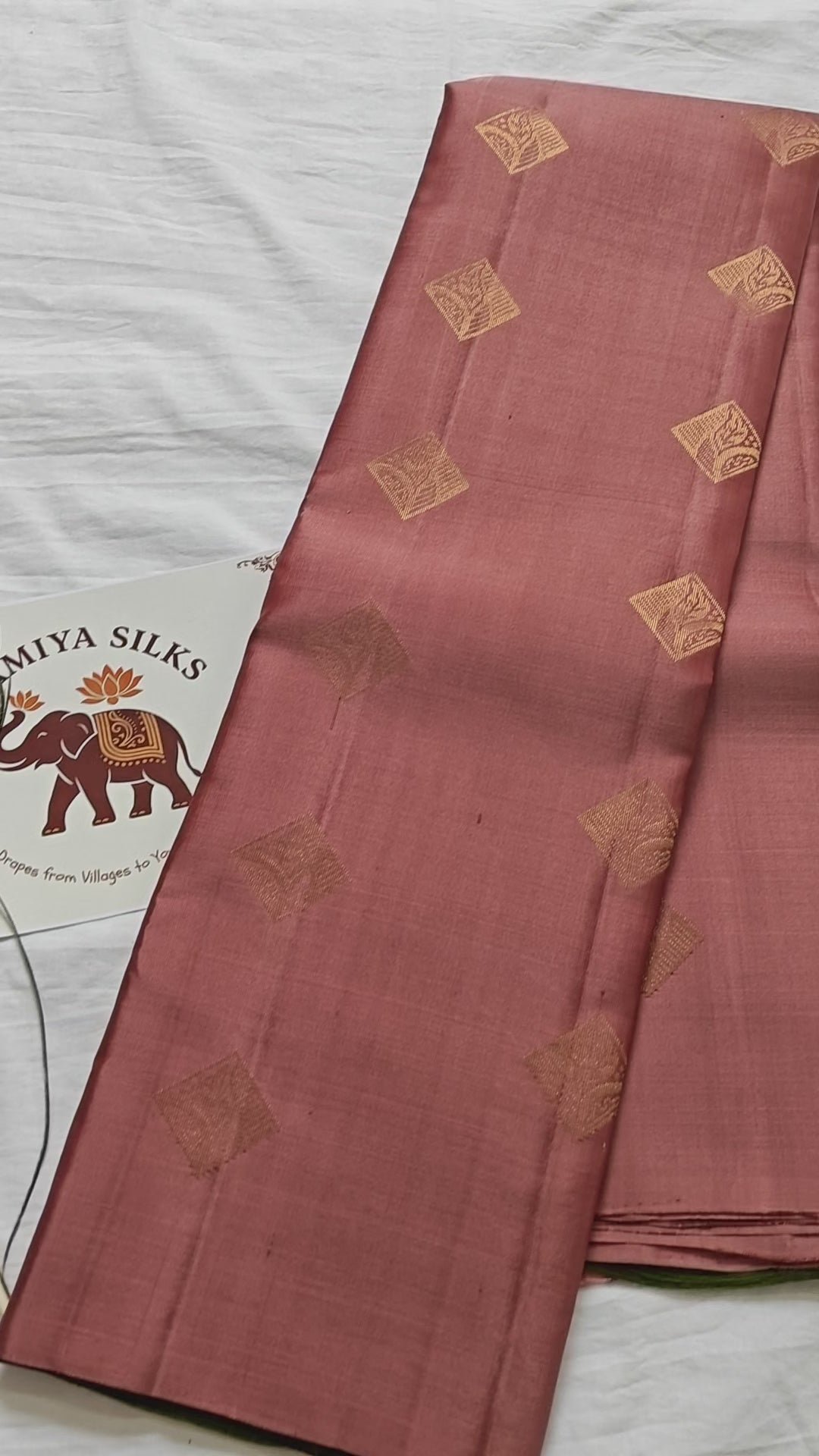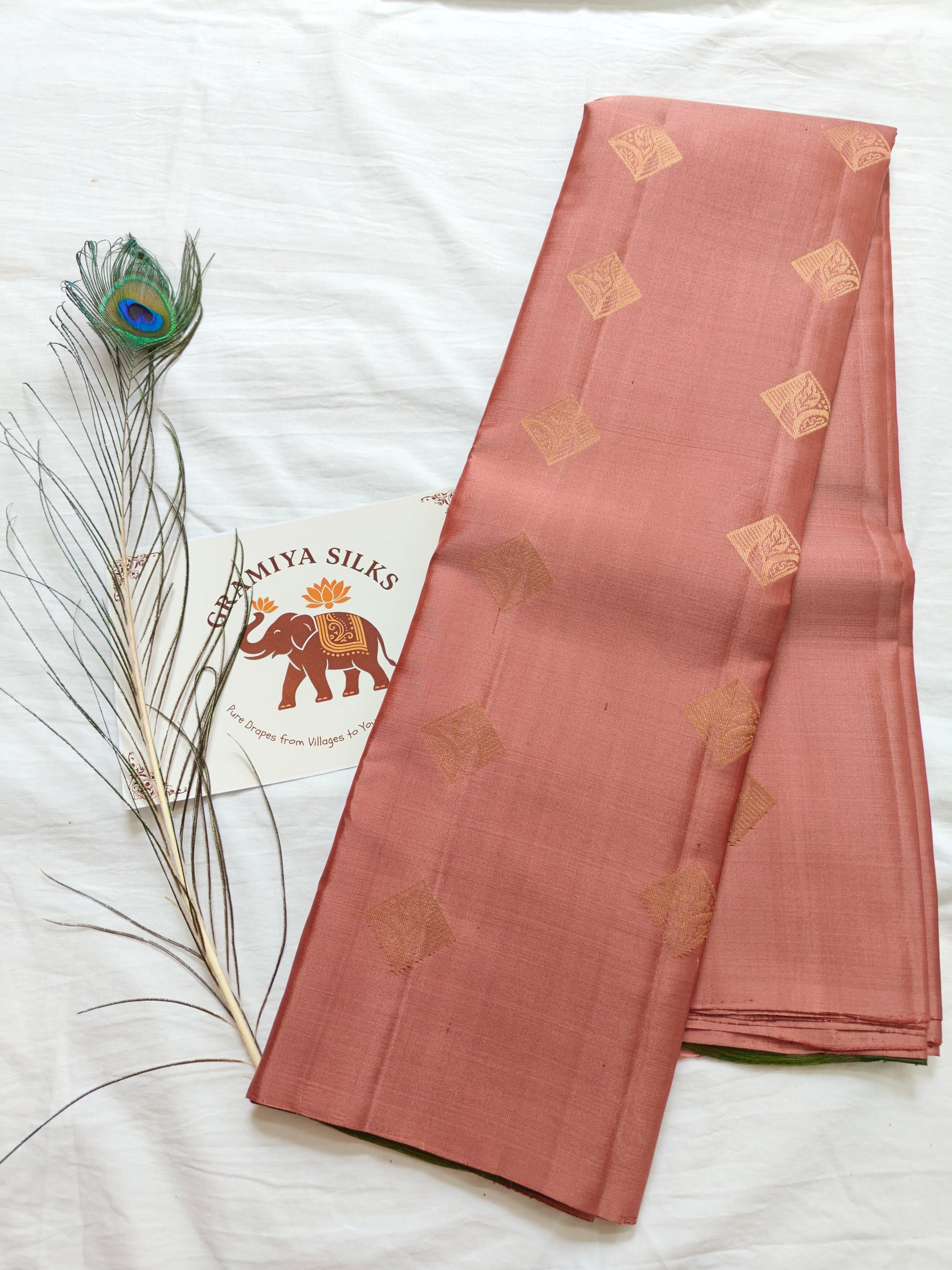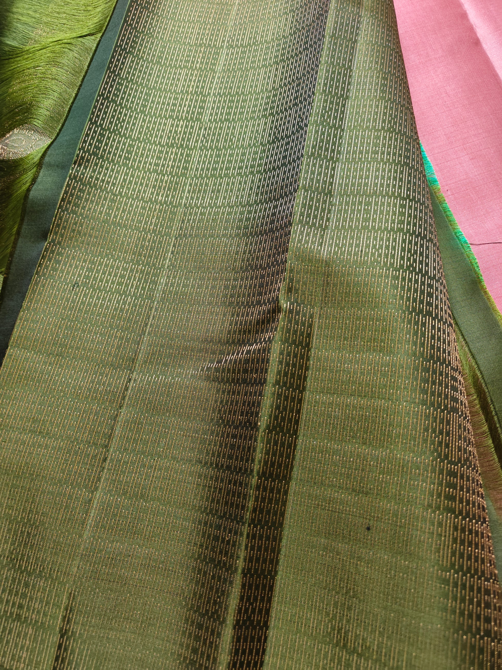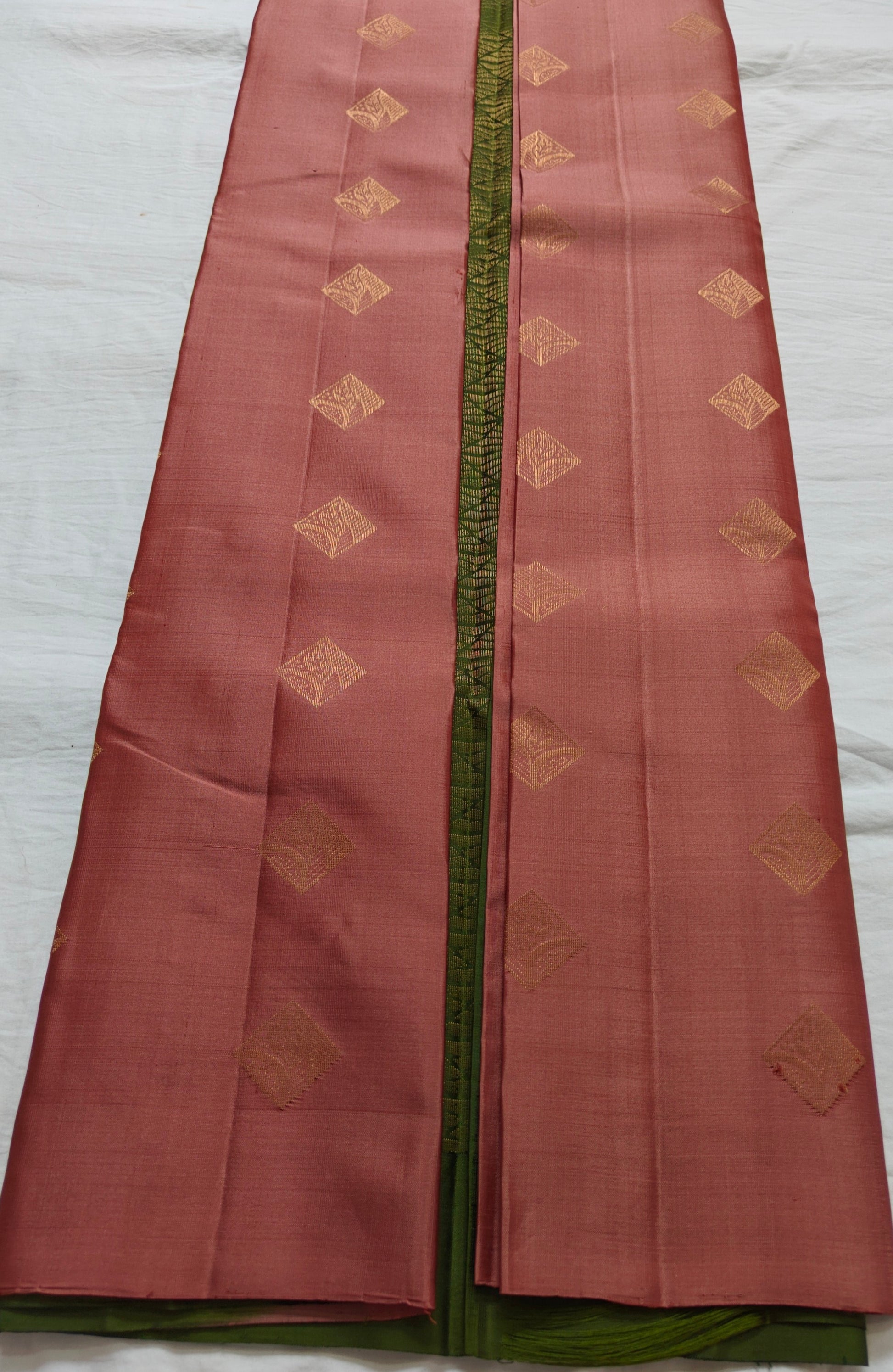 Colours: Rose Gold body, olive green Rich pallu & zari woven blouse