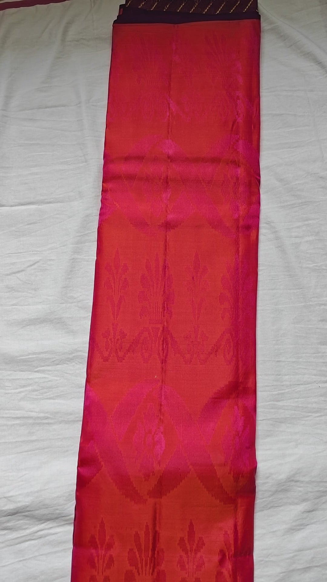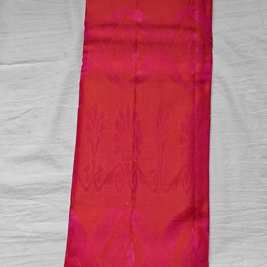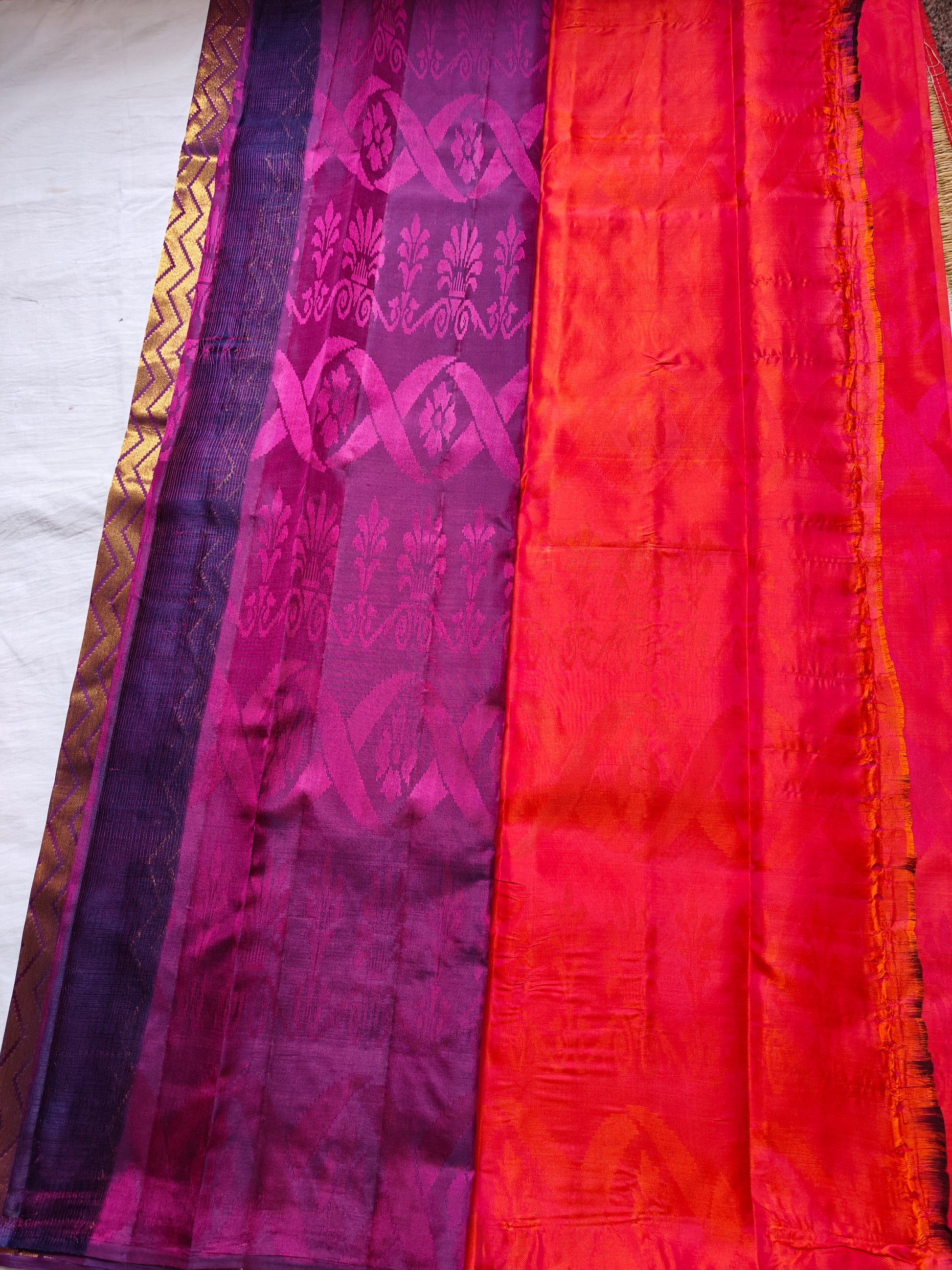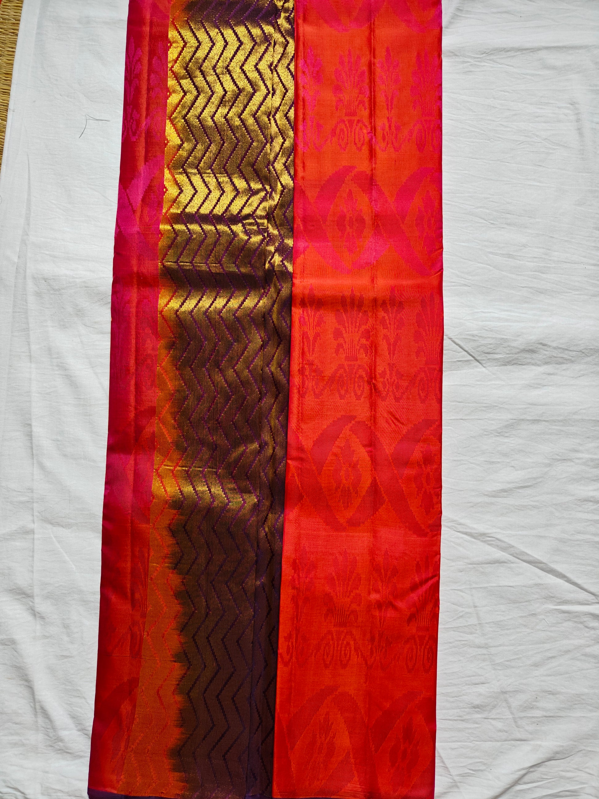 Colours: double shade pink & red self design, purple pallu & blouse, gold zari
